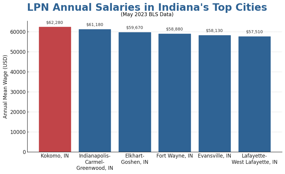 LPNs in Indiana find stable employment opportunities together with competitive salaries especially when nursing shortages exist in their areas. The average yearly salary for LPNs in Indiana ranges between $50,000 and $60,000 based on work experience, geographic location, and employment setting. The wages in Indianapolis and Fort Wayne urban centers are higher than those in rural areas which sometimes offer sign-on bonuses and loan repayment programs. The state’s largest employers of LPNs include long-term care facilities together with home health agencies and outpatient clinics. The continuous need for practical nursing professionals makes this career path an excellent choice for people who want to join the healthcare field immediately.