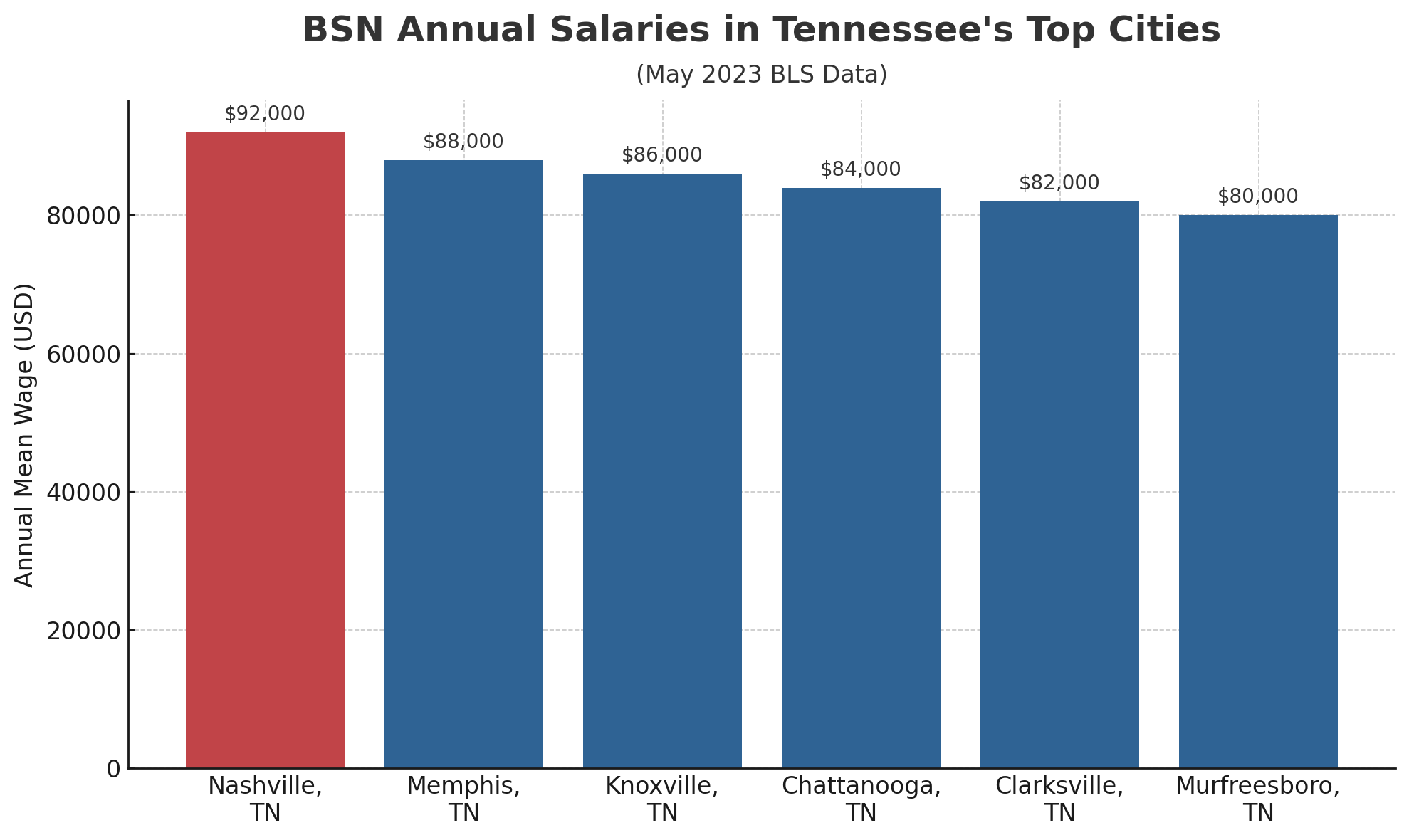 The average annual salary for Registered Nurses in Tennessee amounts to $66,000 according to the current market data. The BSN degree enables nurses to receive better pay since it enables them to pursue leadership roles. The employment prospects for nurses in Tennessee remain promising because of population aging and increased healthcare requirements. BSN-prepared nurses can find more opportunities in cities like Nashville, Knoxville, and Memphis because hospitals actively recruit them to fulfill their rising patient needs. Rural nursing positions come with added benefits including relocation support together with forgiveness of student loans because of the high demand for nursing services.